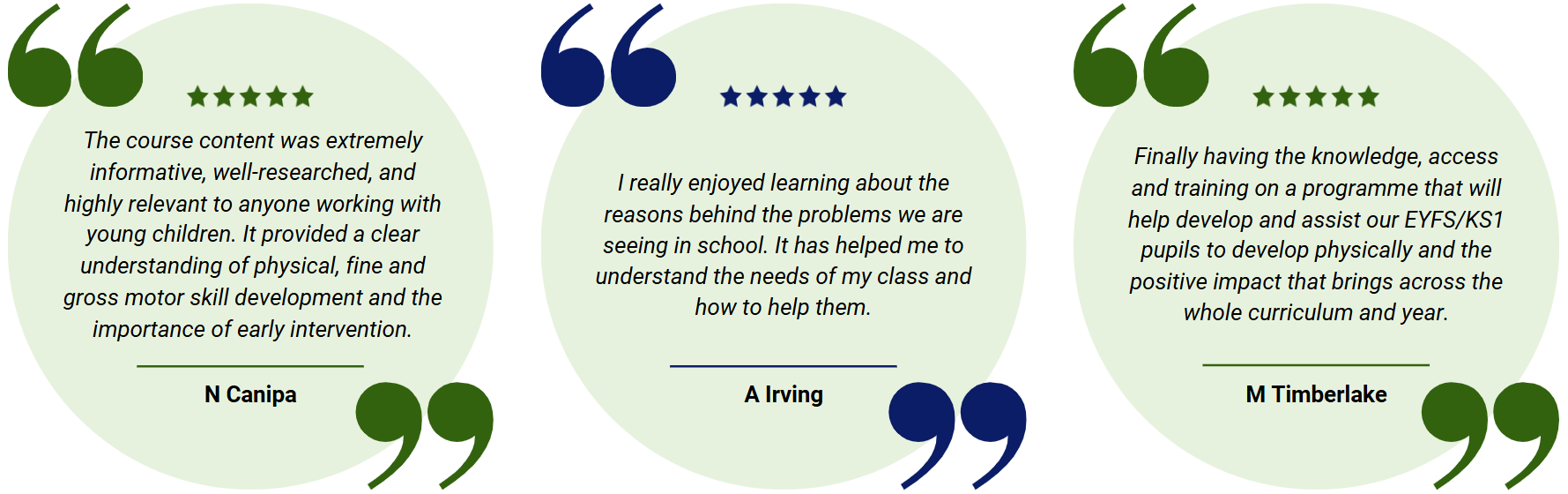 "The Early Years Motor Screening Course was great. It isn't often that we attend courses so late in our career that we learn lots of new things about child development. We have started to carry out the screening across our partnership schools and we expected to see most children being successful in the 15 diagnostic tests. Unfortunately we have seen the opposite. This is a real eye opener for us and the school staff and has really highlighted the need to do the recommended interventions. This is the best programme we have rolled out across the partnership for a while, and we hope to be measuring the impact on children's movement next academic year. For now, it has been a fantastic education for us and our schools on the issues we are facing and the importance of movement and play for this age group." Claire Tennyson Partnership Manager & Executive Director Early Years Physical Development
